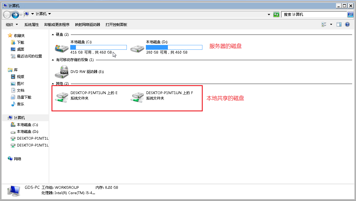 在远程桌面窗口中,打开计算机, 会发现除了服务器原有的磁盘外,还多余了两个磁盘,而这两个磁盘就是你本地的磁盘.通过本地磁盘和远程服务器的磁盘之间文件的拷贝就可以完成服务器与本地直接的文件传输.