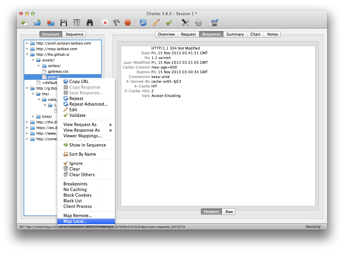 打开 charles,从浏览器打开要抓包的页面 thx.github.io,即可看到数据包:左边的 sequence 和 structure。最迅捷的方式,就是直接在 structure 中,找到要代理的 js 和 css, 右键配置 map 目录,将线上地址映射到本地(下图 1):
