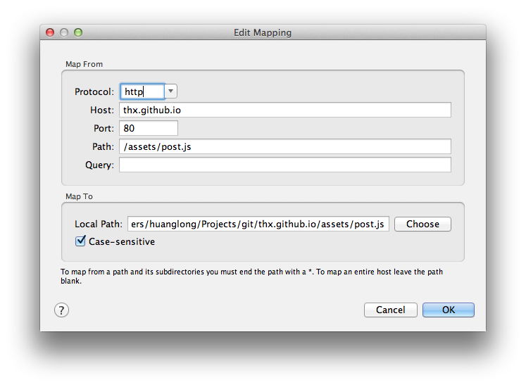 module.exports = [ // 1. replace single file with local one { pattern: 'http://thx.github.io/assets/post.js', // Match url you wanna replace responder: "/Users/huanglong/Projects/git/thx.github.io/assets/post.js" }, { pattern: 'http://thx.github.io/assets/gateway.css', // Match url you wanna replace responder: "/Users/huanglong/Projects/git/thx.github.io/assets/gateway.css" } ]