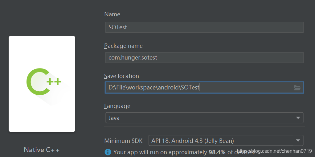 首先,so包会涉及到jni的内容,我们要记得配置NDK,下载好NDK之后,我们开始创建项目,这里比较重要的一步是,我们创建项目的时候要选择C++,如下图: