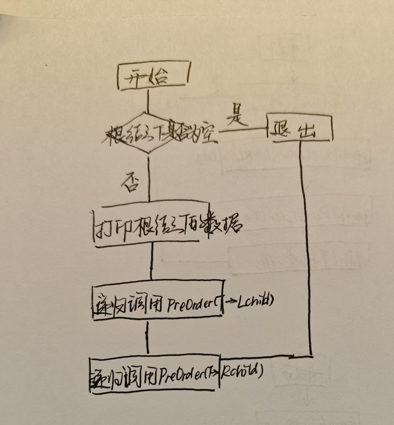 对于任一结点均可看做是根结点,因此可以直接访问,访问完之后,若其左孩子不为空,按相同规则访问它的左子树;当访问完其左子树时,再访问它的右子树。因此其处理过程如下:
