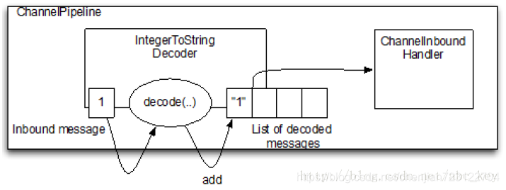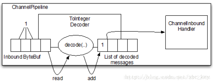 上图显示了从“入站”ByteBuf读取bytes后由ToIntegerDecoder进行解码,然后将解码后的消息传递到ChannelPipeline中的下一个ChannelInboundHandler。看下面的ToIntegerDecoder的实现代码: