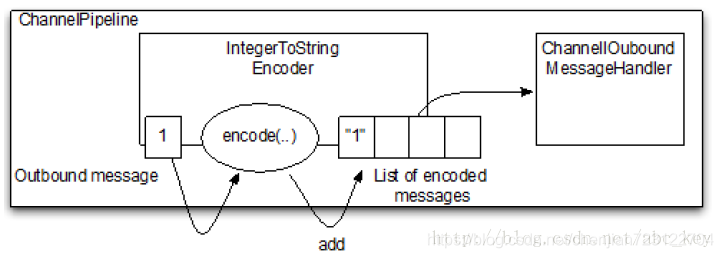 需要将消息编码成其他的消息时可以使用Netty提供的MessageToMessageEncoder抽象类来实现。例如将Integer编码成String,其工作流程如下: