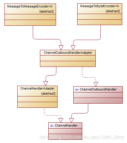 相对解码器,编码器少了一个byte-tobyte的类型,因为出站数据这样做没有意义。编码器的作用就是将处理好的数据转成字节码以便在网络中传输。对照上面列出的两种编码器类型,Netty也分别提供了两个抽象类:MessageToByteEncoder和MessageToMessageEncoder。下面是类关系图:
