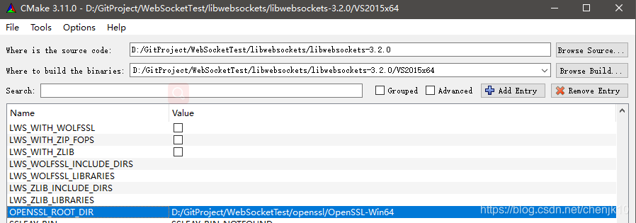 接下来使用cmake选择liewebsockets源码路径和设置工程生成路径,直接configure和Generate就完成了,由于openssl是使用安装包安装的,configure的时候能自动查找到openssl
