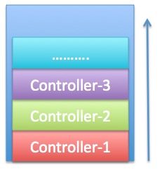 这样运行,显示的是第三个ViewController,这是因为,NavigationController是以栈的方式管理子视图,如图: