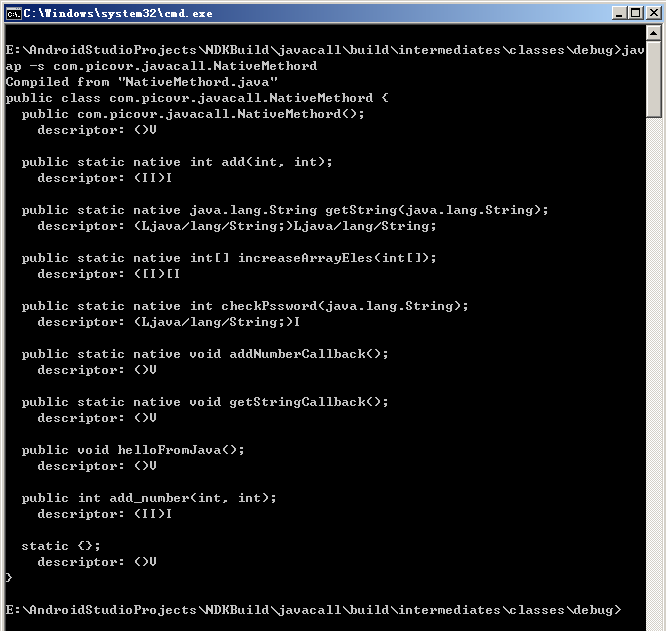 得到方法ID的时候调用GetMethodID(env, jclass1, "add_number", "(II)I");这个方法的最后一个参数是方法签名,对方法签名其实是对字节码进行签名,所以需要先在Java类中写好方法,然后rebuild project,再进入build\intermediates\classes\debug目录下,打开doc窗口执行‘javap -s + 全类名’ 命令,如“javap -s com.picovr.javacall.NativeMethord”: