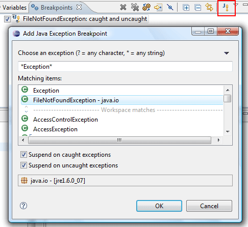 点击这个红圈就能弹出异常断点的窗口,会列出你系统里的所有异常类,然后选择需要断点的异常就OK。
