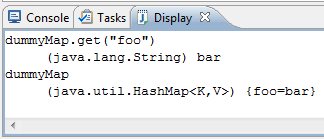 display也是用来观察和修改变量or表达式的,这个应该用的人比较多,在windows->show viewz中打开display窗口,可以在display窗口里写表达式,然后右击选择display运行查看结果或者ctrl+shift+D快捷键组合,表达式可以是程序中一行代码或者你自己写的一个赋值语句来改变变量值之类的。