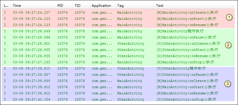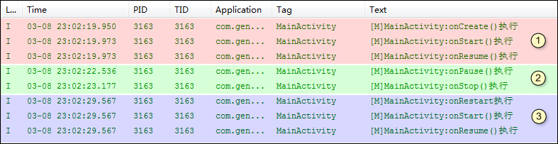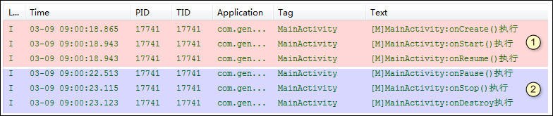 A、第一次运行MainActivity:[M]MainActivity之onPause()、onStop()、onDestroy()执行(上图红色背景部分,图示①)
