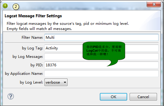 单击“+”号按钮,并在Logcat Message Filter Settings进行如下设置;