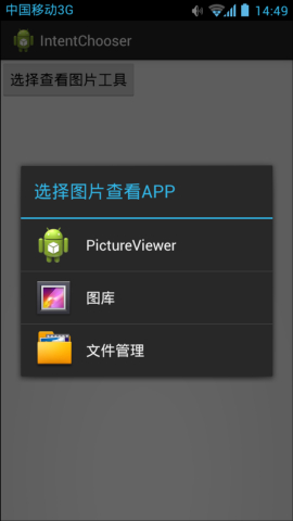 MainActivity.this.startActivity(intent.createChooser(intent, "选择图片查看APP"));