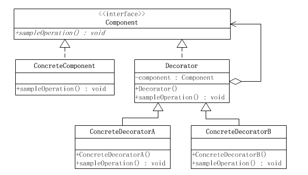装饰者要扩展原来组件的功能,怎么扩展?说白了:装饰者要持有组件对象,装饰者有一个方法对应扩展组件中的一个方法。怎么理解:要扩展原来对象的功能,我首先得有原来对象啊,所以我用一个成员变量持有原来对象,我再有个扩展方法 扩展 组件中需要扩展的方法,前提是这个需要扩展的方法,是有返回值的,他不可能是void啊,因为我需要对他TA个值再进行二次的处理啊,这才叫扩展啊。这个道理很容易理解,其实这里扮演装饰者的角色,你当然可以在任何一个类,方法中都可以做到,但那怎么还称之为模式啊,这里装饰者类是只做这个事情,只与原来组件相关,他是不耦合任何其他操作的。模式是有固定的抽象层面的套路,这里的套路是组件有个父类,组件中需要变化的方法在父类中,由子类重写,而装饰者是为了扩展这些变化的方法,所以装饰者直接或间接也继承组件父类,并持有组件父类引用。
