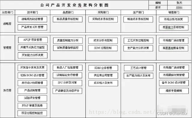 如典型的整车生产企业产品开发业务的业务架构示意图所示:当我们对于某项典型业务的业务组件的构成进行初步的归纳后,能够得到该项业务的一个整体的框架结构,我们可以称之为“业务架构图”,以及在这个框架内,企业中三个层级的员工在该项业务上分别从事着哪些作业内容。分析执行层的业务作业方式和作业规律,你觉得很正常,但如果让你去分析作为你上司的管理层、甚至决策层的作业方式和作业规律时,你也许会感到有所不安。这种心理反应,实际上正好反映出目前很多企业中的一种能力倒置现象的产生原因。很多人都了解这样的事实,那就是,企业中的很多升职后的中高层领导,在就位后的很长时间内,不能进入应有的管理角色中,这绝对不只是个人能力的差异问题,而主要是因为我们的中高层领导总是习惯地认为:研究执行层的作业方式和规律才是他们的主要职责,而没有注意到自己的作业内容和作业方式在整个作业链条中的重要作用,其结果,自然是管理层和决策层领导们的业绩,只好取决于执行层作业人员的努力程度,这种习惯也导致我们的中高层领导们不会去研究影响自己判断能力和决策能力的技术瓶颈是什么。而很多新出现的现代管理模式,实际上就是为了解决中高层领导们的作业能力问题,或是为了解决三个业务层级之间的信息沟通能力的问题,这也就是为什么业务架构分析人员还必须分析战略层和管理层作业形态的原因。下面将分别说明上述三个不同层次作业组件的特点:
