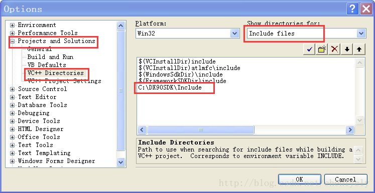 (3)需要手动安装一个DX的SDK开发包,然后将对应安装目录下的Include和Lib目录添加到VS中,在VS2008中配置为:Tools/Options/Projects andSolutions/ VC++ Directories中添加Include和Lib目录,如下所示: