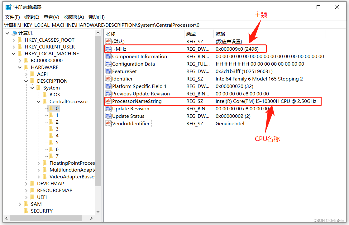 CPU的主频及名称等信息均存储在注册表中,可以到下列注册表位置中读取: