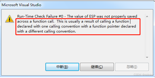 通过/RTC编译选项,可以帮我们发现程序很多潜在的问题,当检测到异常时,就会弹出类似的提示框。还可以检测出调用函数时,函数调用约定不一致导致的栈不平衡问题,当出现该问题时,会弹出如下的提示框:
