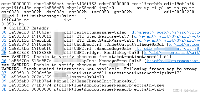 Visual Studio中看不到详细的函数调用堆栈,只能看到问题出在底层的某个dll动态库中。
