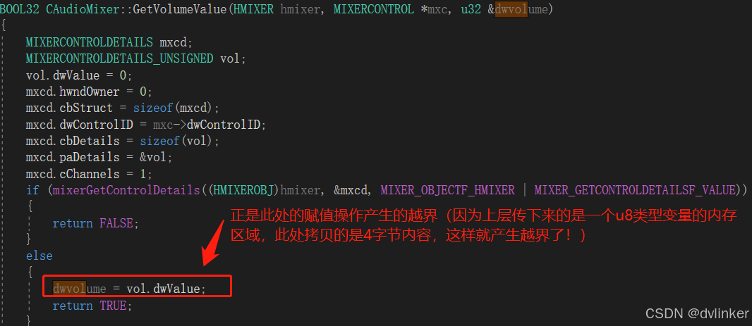 CAudioMixer::GetVolumeValue函数,函数中调用系统API函数mixerGetControlDetails获取扬声器音量大小,获取到的音量保存在MIXERCONTROLDETAILS_UNSIGNED vol的dwValue字段中,然后将该DWORD类型的dwValue值直接赋值给传入的u32引用类型的dwvolume。这个u32(32bit)引用类型正是上层从u8引用强转过来的,此处的赋值拷贝的4字节的内存写到dwvolume中,而这个dwvolume引用其实就是最上层的byVol的引用,而byVol变量是u8(8bit)类型,只占1字节内存,所以此处的赋值导致内存越界了!