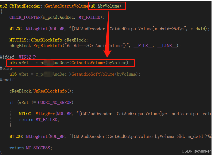 发现该接口中没有触发内存越界的操作,但该接口调用了当前模块中另一个接口pcAudDecoder->GetAudOutputVolume,且传入的正是byVol变量的引用: