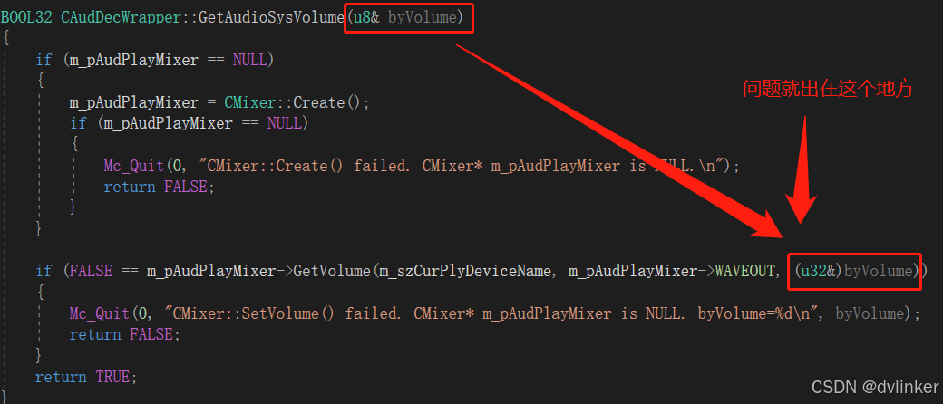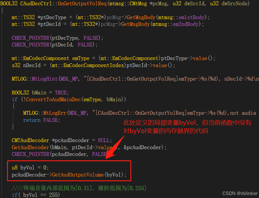 根据Windbg显示的函数调用堆栈,报错窗口中的提示的局部变量byVol位于下层模块的CAudDecCtrl::0nGetOutputVolReq接口中。于是查看CAudDecCtrl::0nGetOutputVolReq接口的代码: