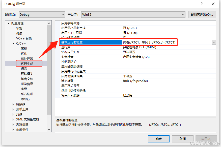 RTC的全称是Run-time Check,运行时检测,即在运行时对相关内存进行检测,在Visual Studio中其对应的是/RTC编译选项。在Visual Studio中,在Debug下,/RTC编译选项是默认打开的,如下所示:(C/C++ ->> 代码生成 ->> 基本运行时检查)