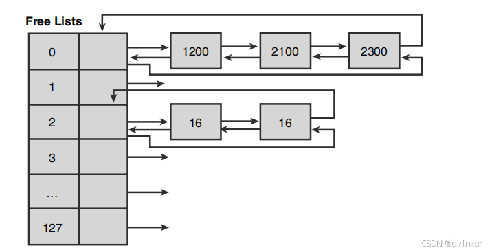 这是一个连续的数组大小为128,每个元素对应一个链表,因为其存储的是整个Heap块的大小,那就包含了用户申请的大小+堆块元数据,而这里元数据大小为8字节, 而最小分配粒度为8字节(32位程序),那么最小的堆块的大小则为16个字节。从数据1~127,每个链表锁存储的堆块大小按照8字节粒度增加。