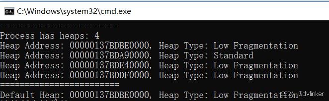 这是一个在Win10上运行的64位程序输出的结果: 这个进程我们并没有在main中显示的创建Heap,我们都知道进程在启动的时候初始化会创建相关的资源,其中也包含了堆。这个进程共创建了四个堆。可以看出来第一个堆就是进程的默认堆,并且是采用的 Low Fragmentation的分配策略的堆。