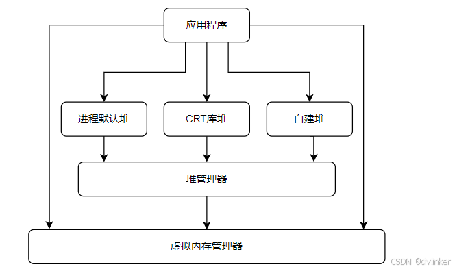 那么堆管理器是通过调用虚拟管理器的一些方法进行堆管理的实现,比如VirtualAlloc之类的函数。同样应用程序也可以直接使用VirtualAlloc之类的函数对内存进行使用。