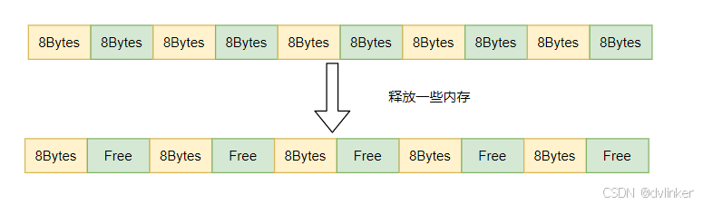 先说说内存碎片我这里简要概述下: 如下图所示假设一段大的连续的内存被分割为若干个8字节的内存块,然后这个时候释放了图中绿色部分的内存块,那么此时总共空出了40字节的内存,但想去申请一个16字节的内存块,却无法申请到一个连续的16字节内存块,从而分配内存失败,这就是内存碎片。
