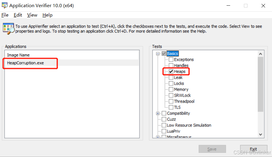 这种方法就是文中开头那个故事中用到的方法。使用Application Verifier, 配置如下图,开启对进程HeapCorruption.exe的Heap配置(其实也是一些操作系统的注册表配置),那么这个时候启动进程,将启用了完全页堆(Full Page)的调试技术。