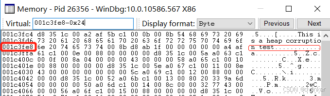 第五步 那么现在我们关心的一个是当前内存是什么内容?一般出现堆破坏很大可能是堆的上溢,那么前一个堆块是什么? 我们先来看看当前堆块的内容。使用了Windbg的Memory窗口, 特意向前偏移了0x24个字节查看更多信息,可以看到0x001c3fe8这个Entry的元数据部分已经被字符串覆盖了。而此时我们可以看到这个字符串是This is a heap corruption test, 根据这个字符串信息就比较容易找到溢出的位置了。