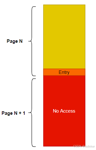 那么当你访问上述Entry越界的时候,将会访问到下一个PAGE_NOACCESS的页面,此时将会有Access violation - code c0000005异常产生,直接中断程序,找到内存溢出的第一现场。
