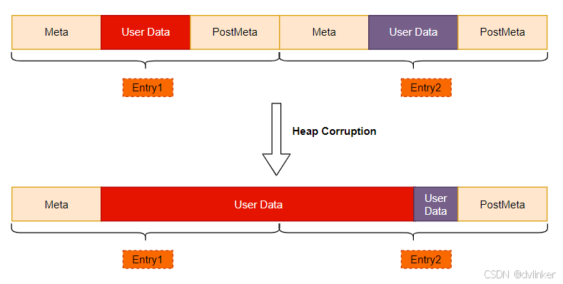 下图展示的了堆是如何破坏的,假设有两处应用程序申请的内存,分别为Entry1和Entry2管理, 并且是连续的内存。那么这个时候拷贝信息到Entry1的User Data, 然而没有控制好拷贝的长度,覆盖了Entry2的Meta和部分User Data。