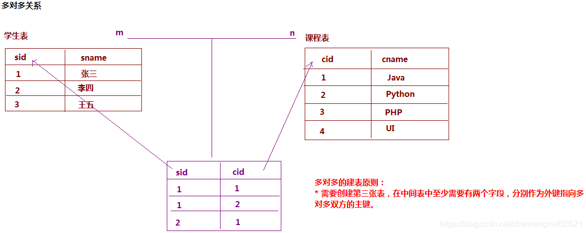 建表原则:创建一个中间表,在中间表中至少需要2个字段,分别作为外间指向多对多双方的主键。