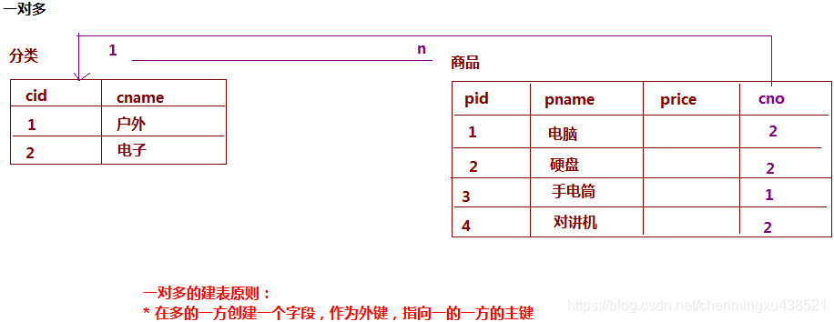 建表原则:在“多的一方”创建一个字段,作为外键,指向“一的一方”的主键。