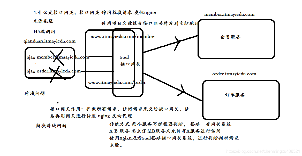 这张图片就会告诉我们为什么会引入网关,因为你如果不加网关,前端请求后端的服务,是可以直接调用的,但是存在着跨域的问题,这时候我们就引入了网关的,如上图所示,再通过网关路由到我们不同的服务调用。