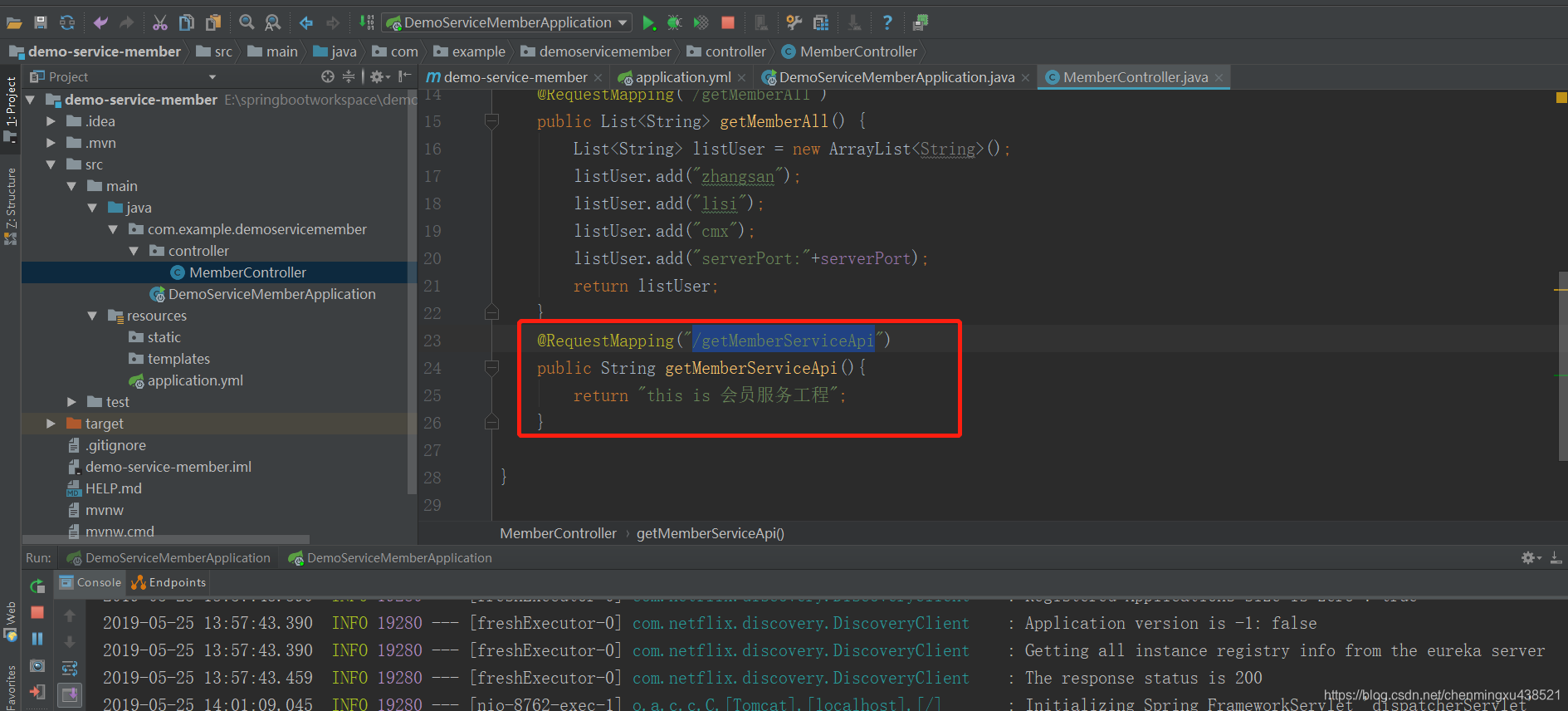 2.3.项目demo-service-member(会员服务代码)添加一个接口