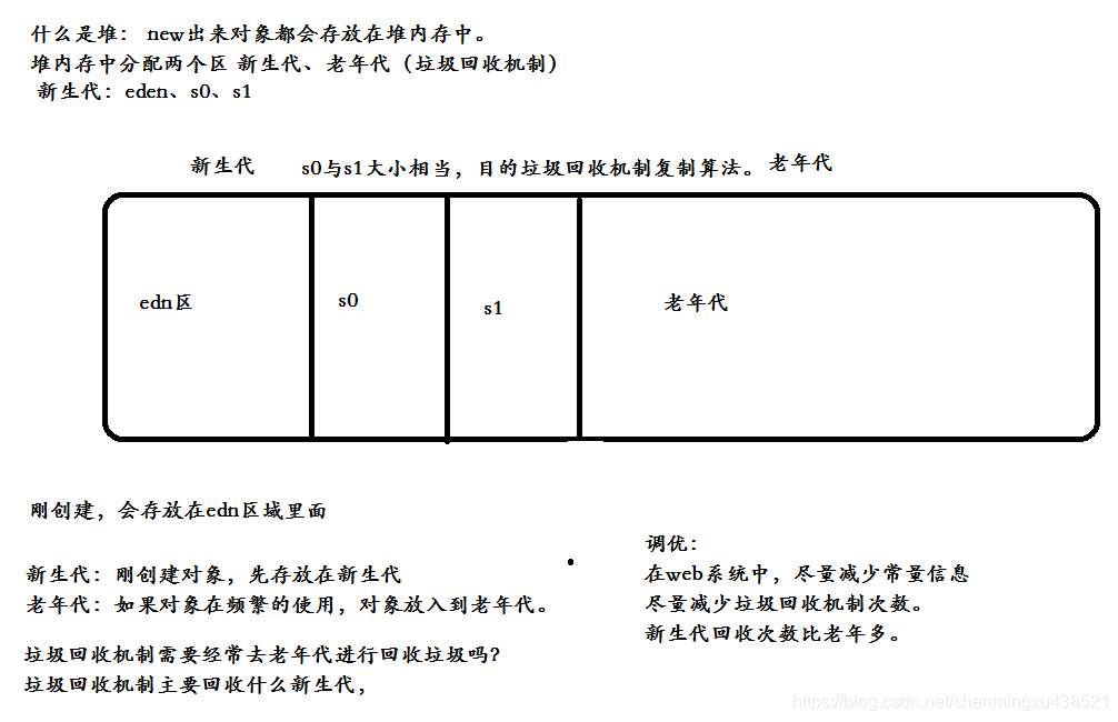 2.首先我们要对JVM参数进行调优,那么我们就得明白java内存结构,这样我们才能更进一步的去了解JVM参数进行调优(主要调优堆和垃圾回收机制,见下图)。