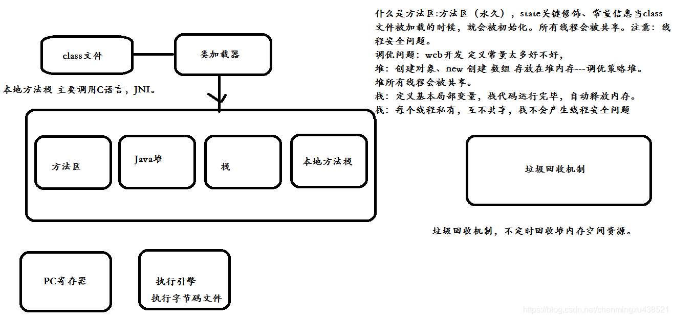2.5.栈:定义基本局部变量,也存类的方法,栈代码运行完毕,自动释放内存,每个线程私有,互不共享,栈不会产生线程安全问题。