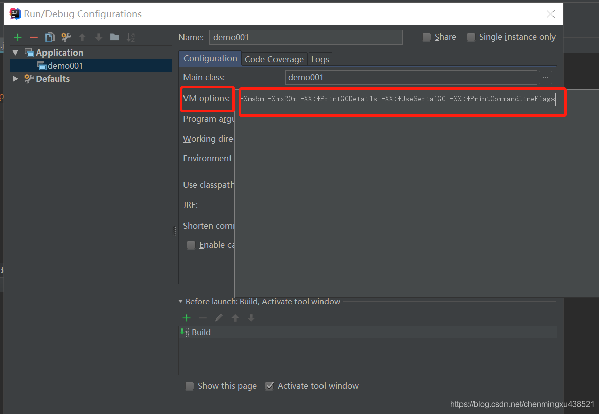 3.1.参数: -Xms5m -Xmx20m -XX:+PrintGCDetails -XX:+UseSerialGC -XX:+PrintCommandLineFlags,// 堆初始值、堆最大可用值、串行回收、每次触发GC的时候打印相关日志,目的减少垃圾回收的次数已达到调优的目的。