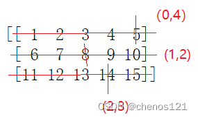 图示如下,两个维度都取三个下标进行索引,相当于从每个维度的整型数组对应位置取出下标组成下标对:(0,4),(1,2),(2,3)进行索引:arr2_3_2[0,4], arr2_3_2[1,2], arr2_3_2[2,3],索引结果形成一个新的一维数组。
