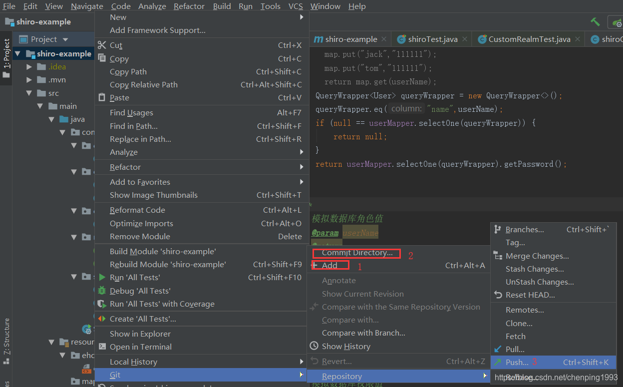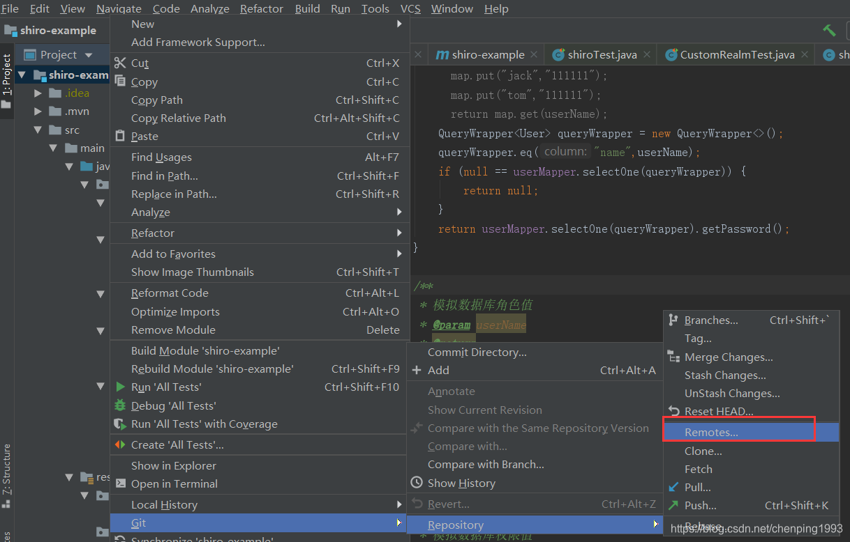 2、右键项目 git--repository--remotes github关联地址,点击remotes弹出框中加入你的GitHub地址例如:https://github.com/yourusername/demo.git