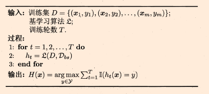 Bagging [Breiman, 1996a] 是井行式集成学习方法最著名的代表.从名字即可看出,它直接基于自助采样法(bootstrap sampling).给定包含m 个样本的数据集,我们先随机取出一个样本放入采样集中,再把该样本放回初始数据集,使得下次采样时该样本仍有可能被选中,这样,经过m次随机采样操作,我们得到含m 个样本的采样集,初始训练集中有的样本在采样集里多次出现,有的则从未出现,初始训练集中约有63.2%的样本出现在来样集中.