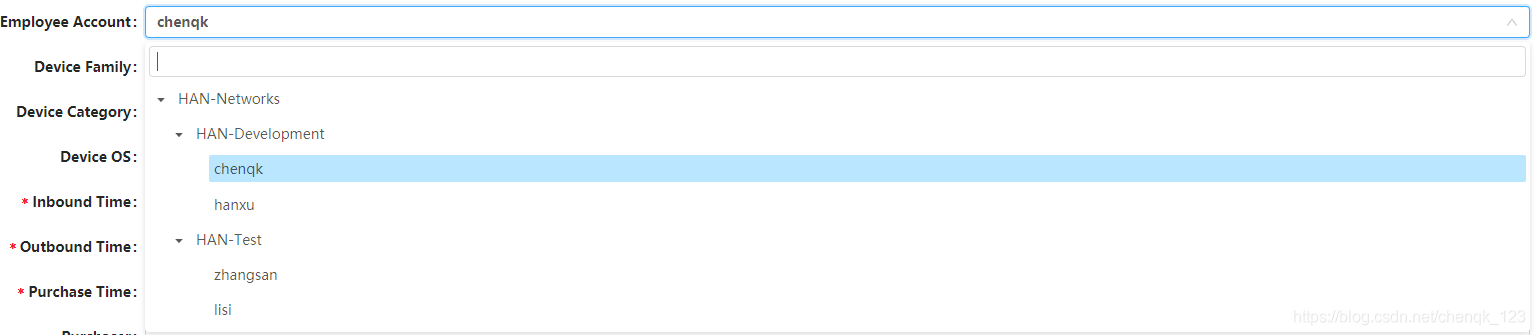 在表单中,我们可能会碰到这样的需求,比如我想将某一个物品或者资产,分配到某一个部门的员工下,那么我们需要在表单中做这样的配置: