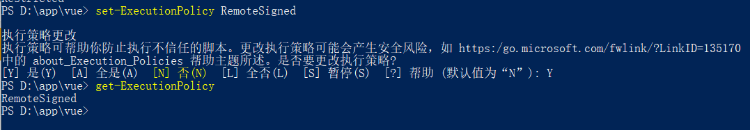 执行操作set-ExecutionPolicy RemoteSigned,会有个提示,可以忽略直接输入"Y",查看一下结果,确实改过来了。