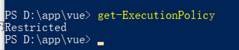 执行get-ExecutionPolicy,发现是"Restricted"即限制的。需要改一下执行策略。