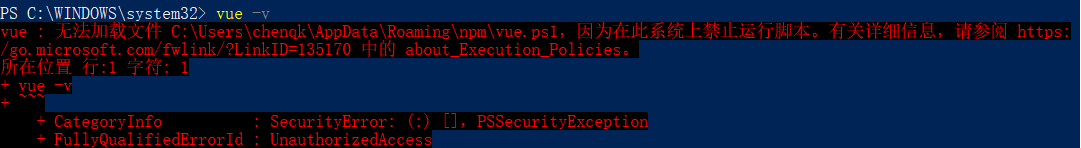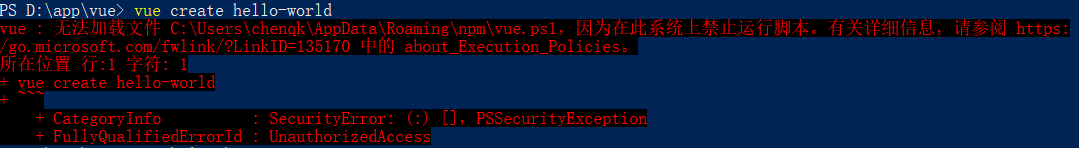 因为实在cmd或者Power Shell上执行的,就觉得是不是cmd的问题。然后又切换到IDE上,无论是在vscode上还是HB上,均出现这种错误。因为确实安装了vue相关的cli,所以觉得应该是权限或者cmd本身的执行策略存在问题。