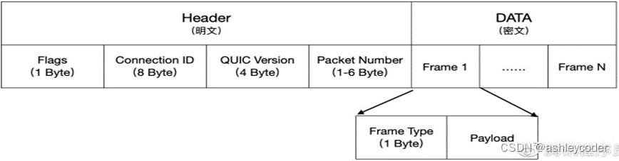重要是DCID和SCID,服务器和客户端的标识。长度--2字节,Packet Number--1字节--变长。