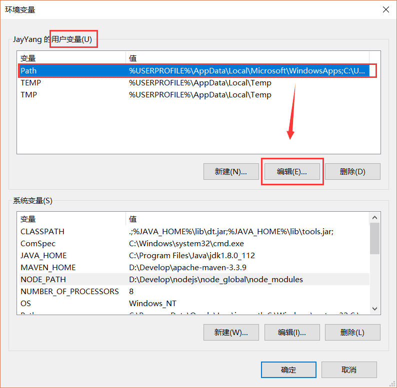 进入环境变量对话框,在【系统变量】下新建【NODE_PATH】,输入【D:\Develop\nodejs\node_global\node_modules】,将【用户变量】下的【Path】修改为【D:\Develop\nodejs\node_global】